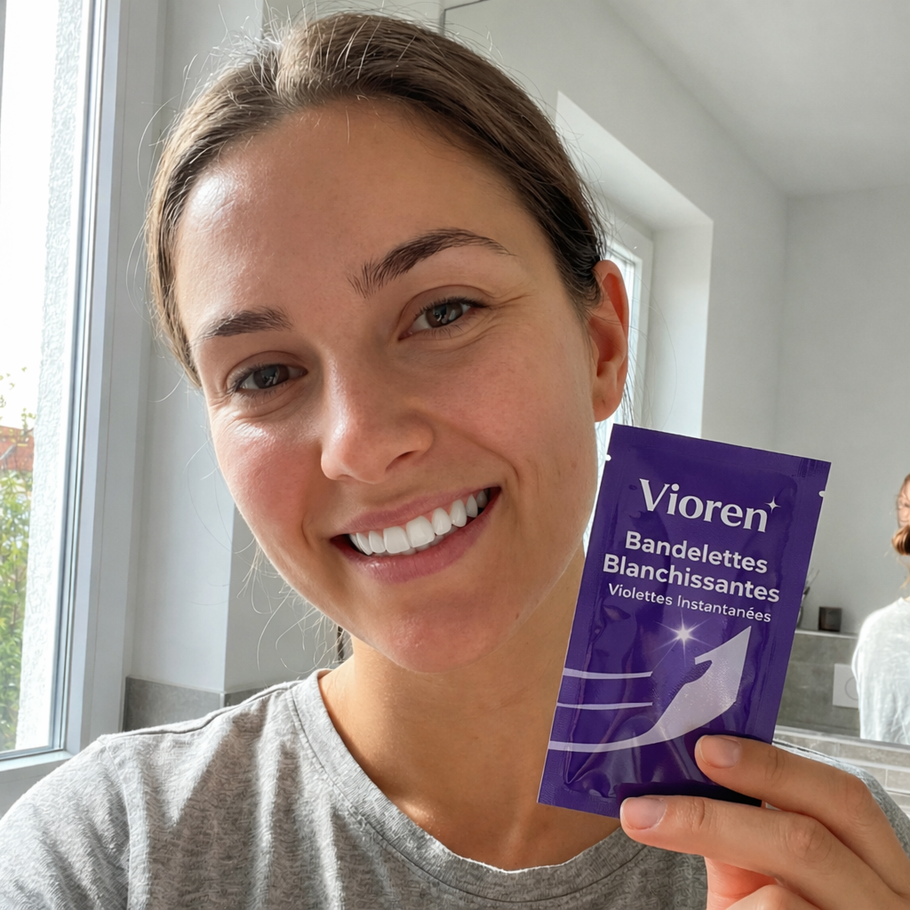 Ces bandes violettes agissent par correction optique de la couleur pour éclaircir visuellement les dents. Elles ne contiennent aucun agent blanchissant (ni peroxyde d’hydrogène/PAP) et ne suppriment pas les taches profondes. L’effet est temporaire et peut être maintenu avec une utilisation régulière. Pour de meilleurs résultats, il est recommandé de se brosser les dents avant l’application. Ne pas utiliser chez les enfants ou adolescents de moins de 18 ans, ni en cas de dents sensibles, de problèmes de gencives ou de caries. En cas de réaction désagréable, arrêter l’utilisation et consulter un dentiste.